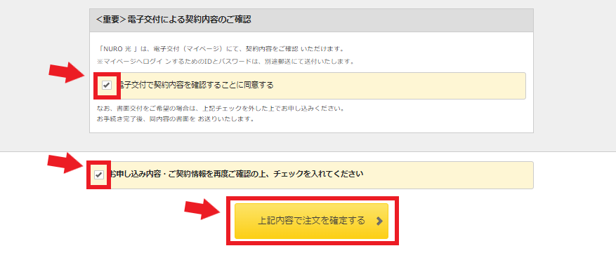 入力した内容を確認して、間違いがなければ電子交付による契約内容の確認、お申込内容の確認のチェックマークを「クリック」してチェックする。