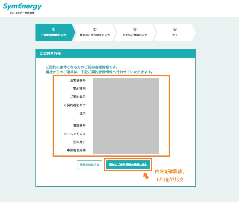 契約者情報の内容を確認後、「電気のご使用場所の登録」をクリック